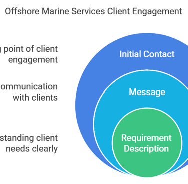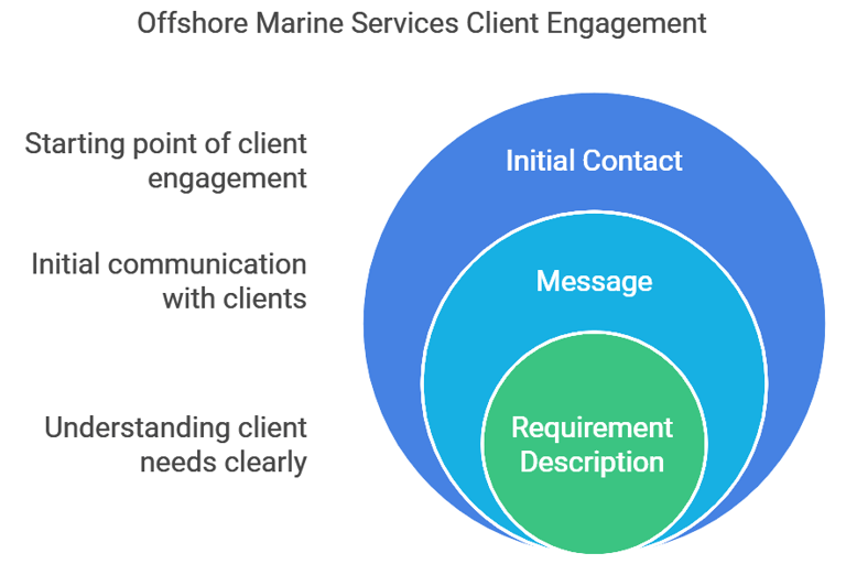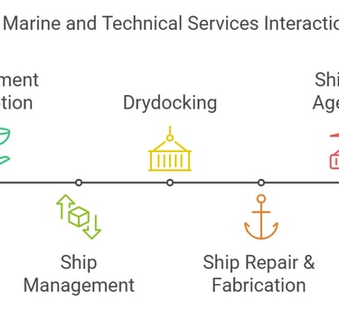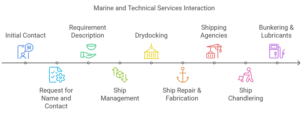 Initial Contact → Contact Verification → Requirements Assessment → Ship Management → Drydocking Services → Repair/Fabrication → Agency Services → Chandlering → Bunkering