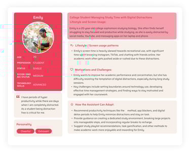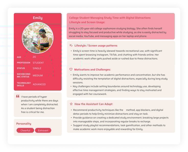 Emily is a 20-year-old biology major and tech-savvy college sophomore who struggles to balance study time with digital distractions. She is obsessed with social media and YouTube. While she’s highly motivated to improve her academic performance, staying focused during long study sessions remains challenging. Emily aims to enhance her time management skills, set boundaries around technology use, and break large projects into manageable steps. She seeks tools like productivity techniques, app blockers, and engaging study strategies to stay on track and achieve her academic goals.