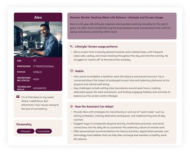 Alex is a 32-year-old software engineer who has been working remotely for the past two years. With screen time heavily focused on work tasks like video calls, coding, and emails, he often struggles to "switch off" at the end of the day, blurring the lines between work and personal time. Concerned about burnout and the effects of prolonged screen time, Alex aims to establish a healthier work-life balance by setting boundaries and creating dedicated spaces for work and leisure. He seeks tools like schedules, digital detox strategies, and mindfulness practices to help him recharge and maintain balance.