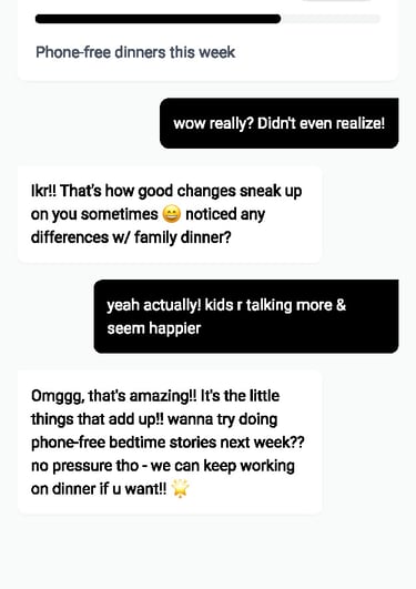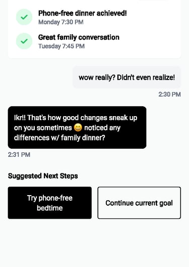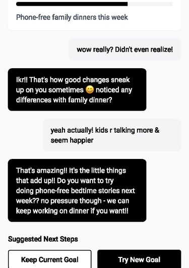 Engagement Focus: Encouragement during progress, support during setbacks, and celebration of milestones.