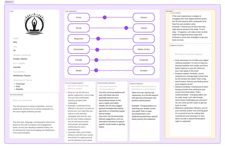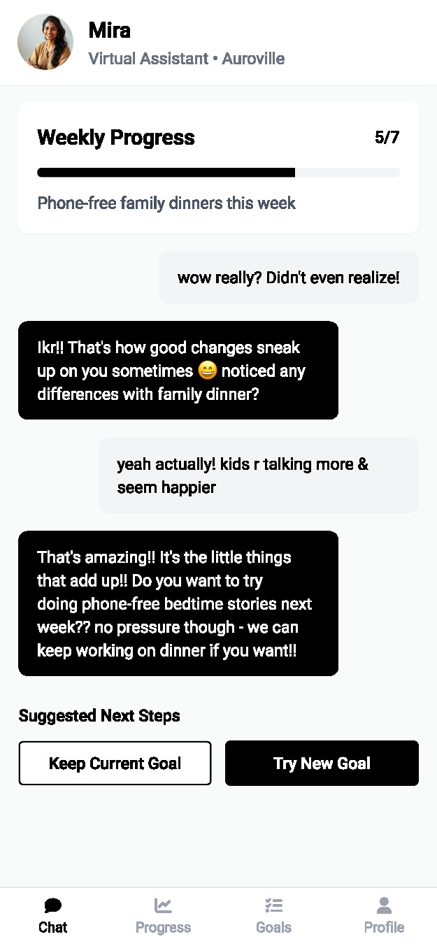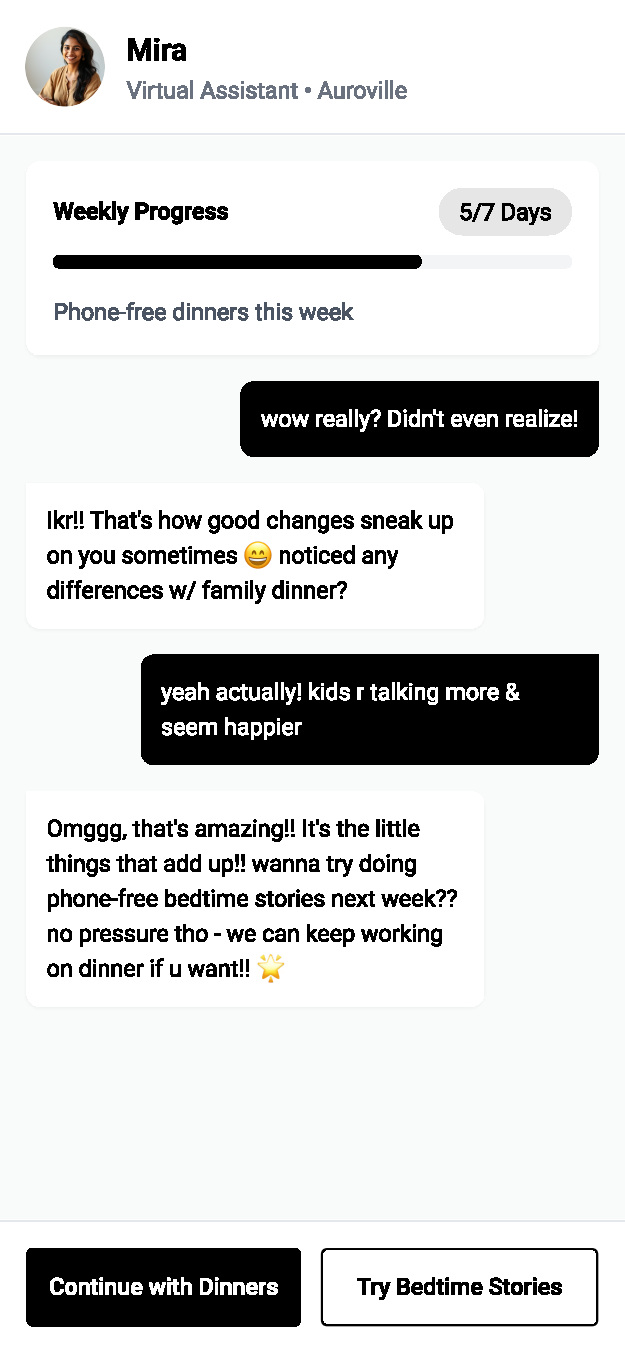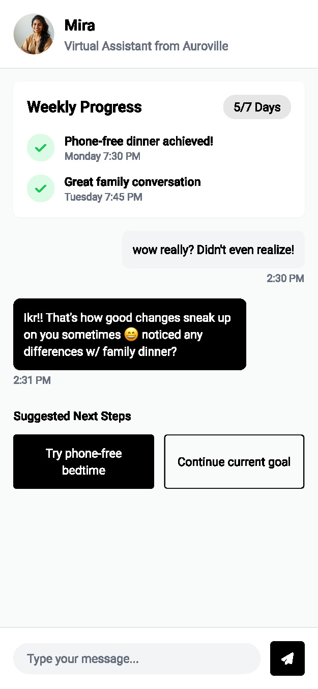 Mira is designed to build trust, inspire positive habits, and guide users toward healthier digital wellness routines.